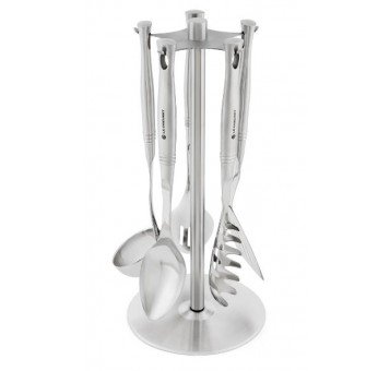 -. Feature : Constructed from stainless steel / Includes ladle, solid and slotted spoon, pasta fork, slotted turner, and rotating stand / Elliptical shaped handle for better grip / Dishwasher safe; wipe clean stand