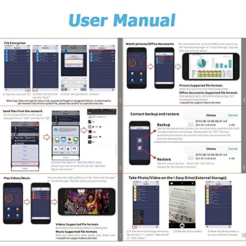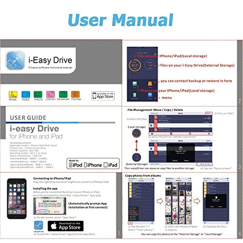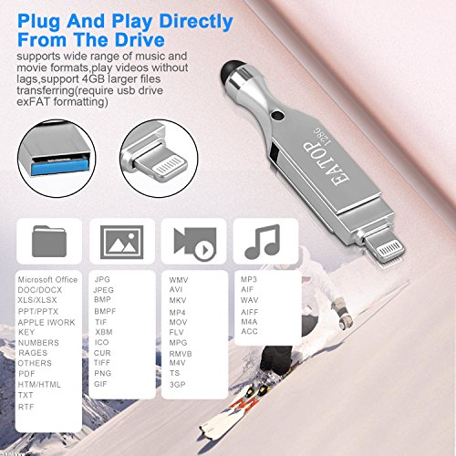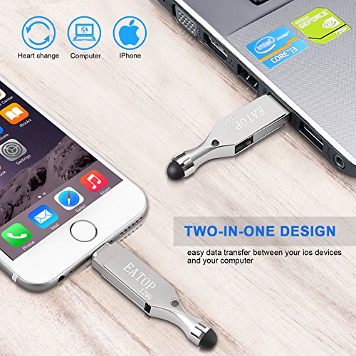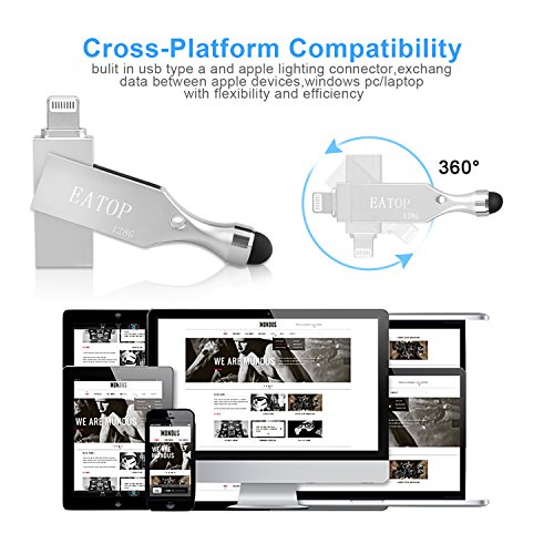 -. Feature : Hybrid 3 in 1 USB Flash Drive,just buy it, enjoy your unique style. Transfer pictures / music / movies from your computer to iOS flash drives with read speeds up to 80 MB / s and write speeds of 30 MB / s. / Design 1: Have a soft pen tip to help protect the screen from pollution and improve the sensitivity,Compatible with Apple iPad, iPhone, iPod and any tablets or smartphone. / Design 2: 360 ° rotating USB flash drive, extending 128GB of external memory / memory expansion to your iPhone / iPad / - shooting more photos, enjoying longer videos and doing more of what you like. / Password protect your data safe on "i-easy Drive" (flash drive) and "iPhone" (in-app storage). Open TouchID and Password on setting to secure your whole storage, or Lock selected files with password. Perfect to protect individual P.R.Ivacy / (WATCH MOVIES DIRECTLY FROM THE FLASH DRIVE) -Plug and play,enjoy movies or musics stored in the flash drive when you are on trip or travel, most video formats are supported: (VIDEOS: AVI, M4V, MKV, MOV, MP4, MPG, RM, RMVB, TS, WMV, FLV, 3GP; AUDIOS:FLAC, APE, AAC, AIF, M4A, MP3, WAV) 18 Months Worry-free Warranty & dedicated email customer support.