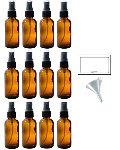 2 oz Amber Glass Boston Round Fine Mist Spray Bottle (12 pack) + Funnel and Labels for essential oils, aromatherapy, food grade, bpa free