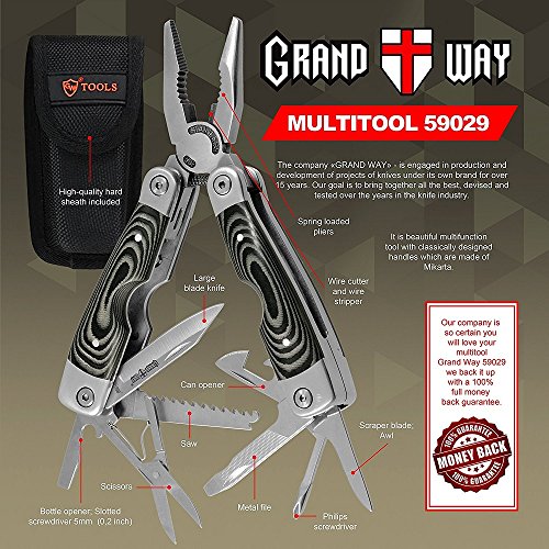 The list of possible activities where the functional survival pack is useful makes it not only a multi-tool kit for men. With the help of Grand Way Multi-Tool 13-in-1, every woman can solve problems by herself. Big toolkits take so much space when storing them, and handle casual tasks the same as Grand Way Multi-tool. Imagine that you have a durable and effective tool kit that can be worn on your belt (due to a comfortable case), in your pocket, in a camping backpack or in a special bicycle or car section. It is multifunction, quick-deploying and is always ready to help you in emergency situations like cutting seat belts after a car accident. Our tool has heavy-duty construction and is pleasant to the touch. An additional important function of Grand Way Multi-tool is plyers shaped with narrowed lips, which makes delicate work, like snipping a wire, and also catching and manipulating comfortable and simple. The high quality materials used in multi tool kit makes the tool reliable and sturdy Free stiff case in addition to a multi-tool. Multi-tool holder protects the gadget from damage and lets you wear it on a belt. Using this,you’ll always be ready to handle any problems at home, in the garage, when cycling, picnicking, fishing or hunting ? anywhere, anytime! Makes a great gift idea, perfect for Fathers Day, Christmas, birthdays and other celebratory occasions. Dream of all boys gadget fans. ? 0 |