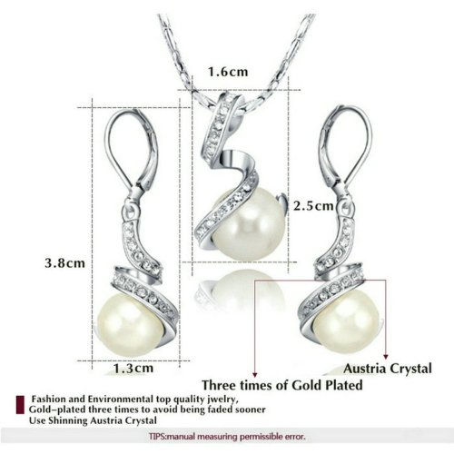 - Feature : This jewelry sets consist of a pair of dangling earrings and a necklace with white pearl pendant and Austrian crystals decorated with sparkling grace and beauty. / Three layers of 18K white gold plated, nickel free and tarnish free, silver color. The set is a perfect accessory to your outfit or as an appropriate gift used in wedding and engagement party or other occasions. It brings an elegant and graceful look to any special occasion. / The necklace chain is 15.7'' long with an 1.95'' extended line which is convenient for you to adjust the length. / The necklace pendant size is 1''*0.6'', the dangling earring size is 1.5''*0.5''. / Shipped out in an exquisite jewelry gift box. If not fulfilled by Amazon, delivery time 7-15 days. One year warranty.
