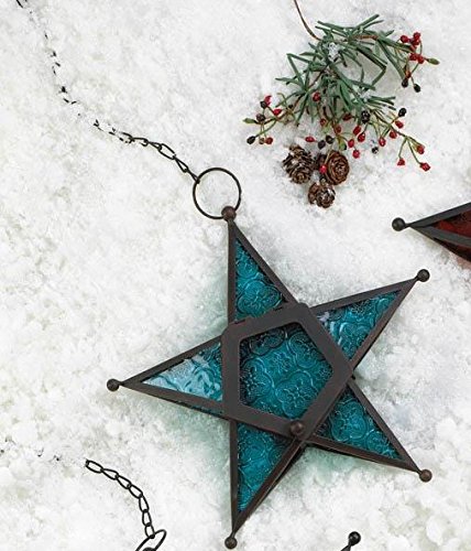 -. Title : Beautiful Blue Glass Star Candle Lantern w/ Wrought Iron Frame NEW Home Decor