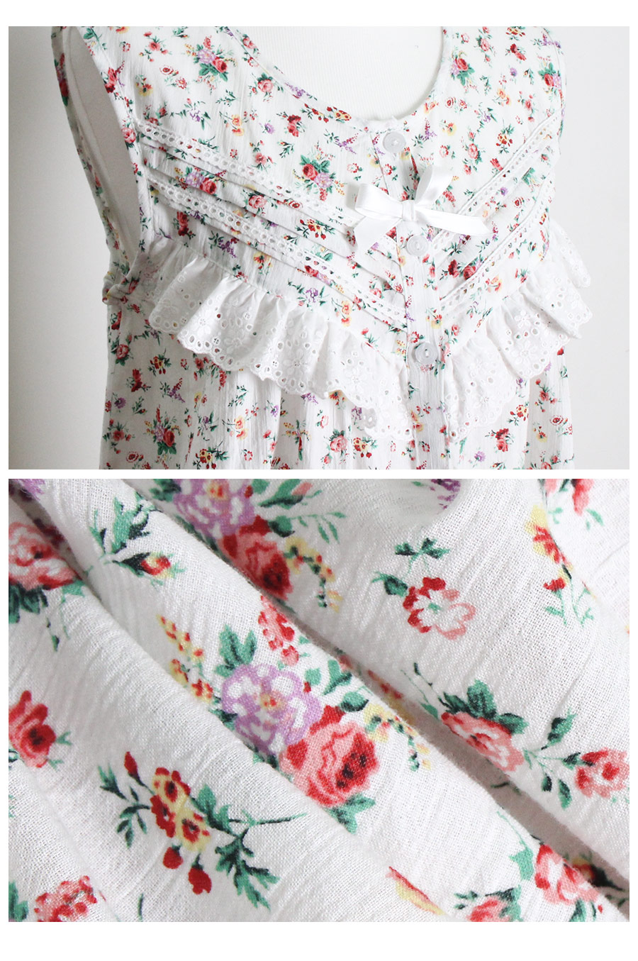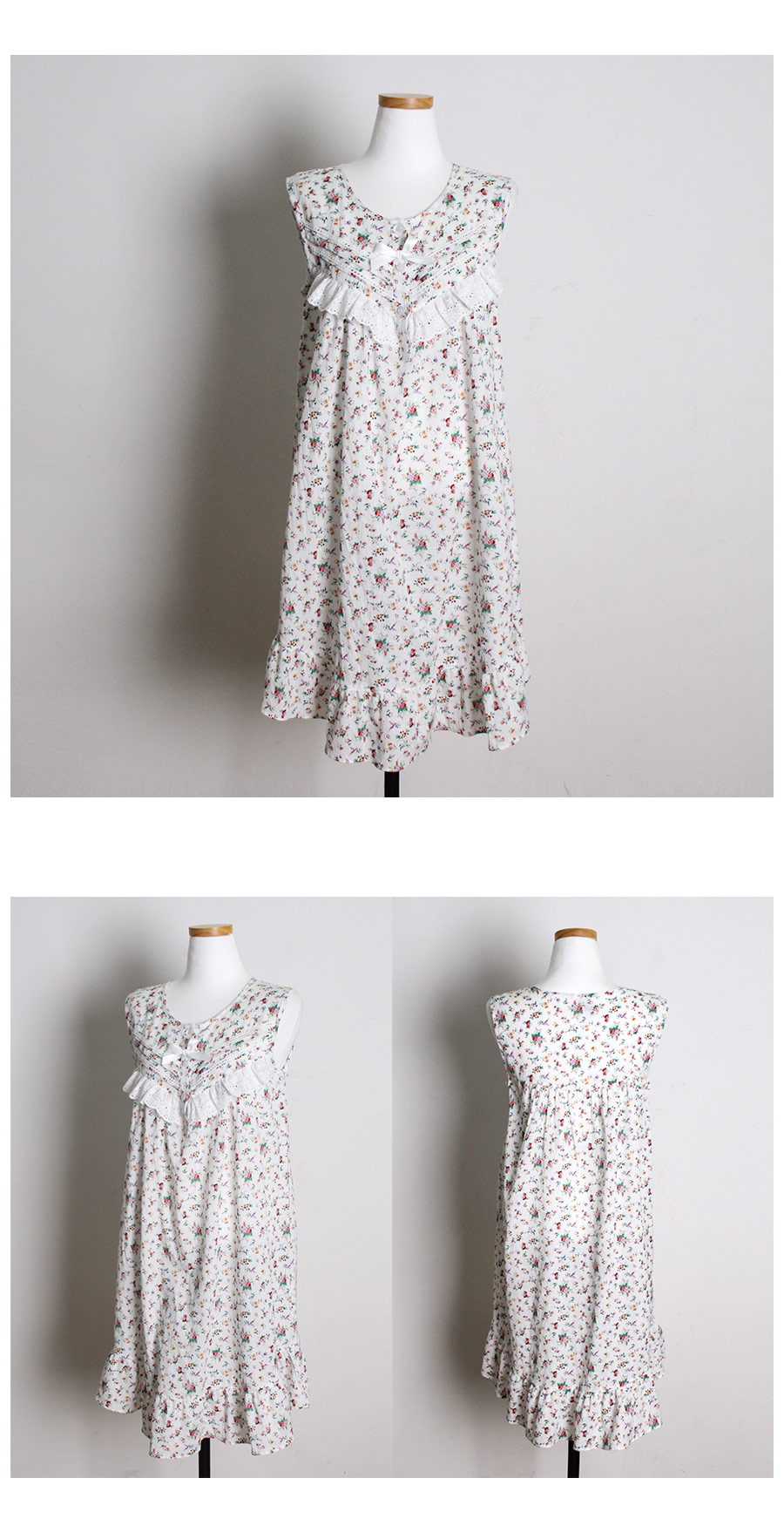 DETAIL 시원하게 착용하기 좋은 민소매 디자인으로 사선으로 레이스를 여러겹으로 봉제해 포인트를 주고, 바스트 라인을 따라 면 레이스 장식을 2중으로 봉제했습니다. 편안하게 연출하기 좋은 여름 잠옷으로 러블리하고 여성스러운 분위기를 내기에 좋습니다. 클로징 버튼은 길게 내려 탈착용이 용이할 수 있도록 디자인했습니다. 100% 국내 생산으로 봉제선이 깔끔하고, 디자인과 부자재, 소재의 퀄리티가 높습니다.