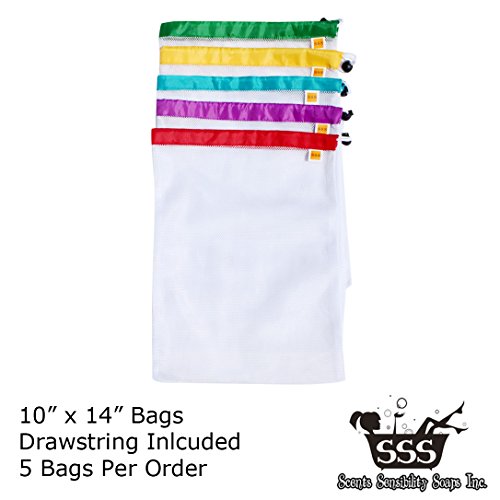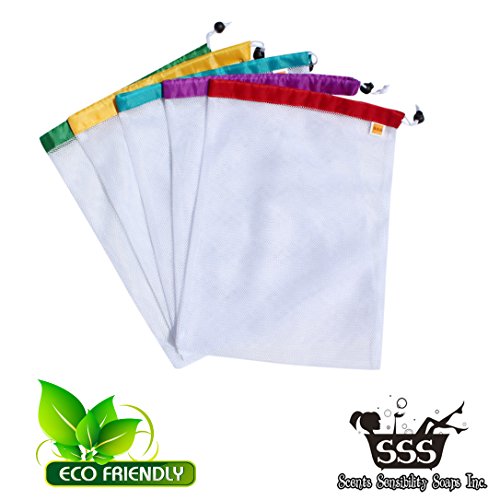 Eco Friendly Washable & Reusable Grocery Produce Bags - Premium Large Lightweight Nylon Mesh Produce Bags - 10" X 12" - Set of 5 (Red, Orange, Green, Blue, Purple)