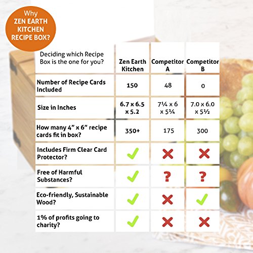 Studio : Zen Earth Publisher : Zen Earth Product Description ? Always Keep Your Family's Recipes Dry, Safe Secure - Starting Today! Are you looking for a way to store all those recipes your mother passed to you - as did your grandmother before her? Don't you dislike all those cheaply made and ugly looking boxes - which you doubt whether they'll last more than a couple of years? Would you prefer a beautiful, elegant, timeless solution you'll one day be able pass on to your own children? ?Zen Earth Ultimate Kitchen Recipe Box Bundle - A Must have For Every Kitchen! It's time your precious family recipes got the luxurious home they deserve. Each of the wonderful recipe boxes are lovingly handcrafted from gorgeous bamboo wood and each box features a divider in the middle of the box to keep the cards standing upright. Each box can hold more than 350 of your 4x6 recipe and index cards. There are 150 recipe cards (Printed in USA)provided. Additional recipe cards are available for purchase, sold separately. Your bamboo recipe box will keep them safe, dry, and secure for decades to come, and can even become a family heirloom that passes from one generation to the next! ?Exclusively Handcrafted With Beauty Excellence In Mind For us, these boxes are more than simple wood containers; they signify a beloved part of family history and tradition - so there's no room for cutting corners. Zen Earth premium recipe boxes are carefully designed and precisely crafted by family people, for family people, from the best quality natural, sustainably grown bamboo. They are free of any harmful substances, and 100% safe for you and your loved ones. ?Plus, 1% of the boxes' profits goes to charity! What's not to love? So, What Are You Still Waiting For? Order Your Own Zen Earth Ultimate Kitchen Recipe Box Bundle Right Away! Just Click "Add To Cart" Start Your Own Family Tradition Today! 0 |