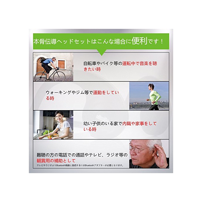 장시간의 사용으로도 쾌적,귀를 막지 않고 음악을 듣고, 동시에 고막부터 환경음도 듣 네 #「골전도 헤드폰」입니다.진동을 뼈에 전하는 것에 음을 듣는 모아 둬 고막에의 부담이 적고, 장시간의 사용으로도 쾌적하게 사용하실 수 있습니다.통화 가능,마이크 탑재에,iPhone등의 스마트 폰에서는 통화로도 대응입니다.귀를 막지 않기 때문에 이동 중,운동 중도 주위의 음이 들려 안전.
