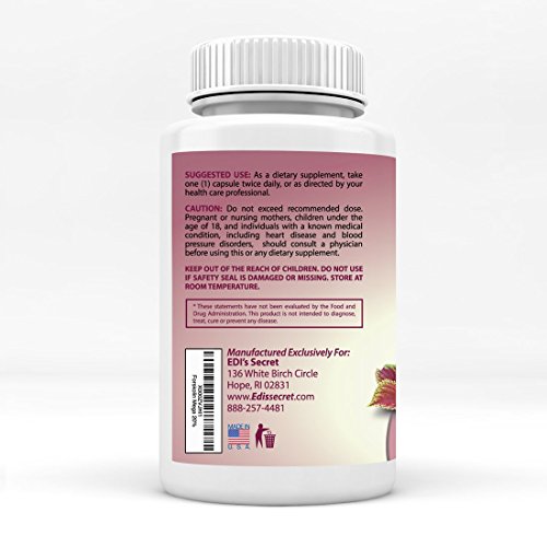 -. Binding : Misc. -. Brand : Edis Secret -. Feature : Effective, organic herb weight loss and fat burning supplement / Boosts metabolism, supporting metabolic health / Promotes lean muscle mass while breaking down fat cells / All natural, vegan supplement promotes appetite suppression / 100% satisfaction guarantee. If you're not happy with your purchase, return it within 30 days of purchase, for a full refund. -. IsAdultProduct : 0 -. Label : PL Nutraceuticals -. LegalDisclaimer : These statements have not been evaluated by the Food and Drug Administration. The products above are not intended to diagnose, treat, cure, or prevent any disease. -. Manufacturer : PL Nutraceuticals -. MPN : EDI-FRS-60 -. PartNumber : EDI-FRS-60 -. ProductGroup : Beauty -. ProductTypeName : BEAUTY -. Publisher : PL Nutraceuticals -. Studio : PL Nutraceuticals -. Title : Edi's Secret Forskolin Mega Weight Loss Aid, 125mg per serving, 60 capsules