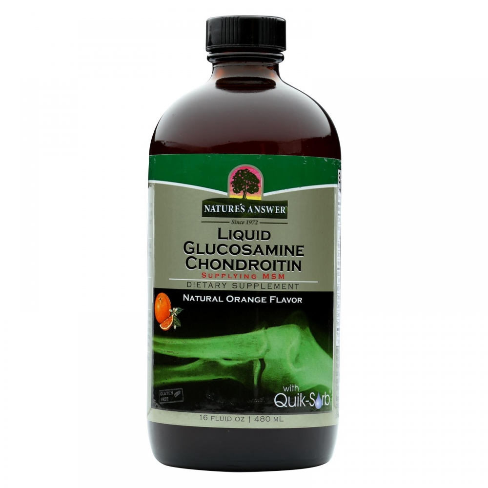 | Nature's Answer Liquid Glucosamine and Chondroitin with MSM Natural Orange Description: With Quik-Sorb This formula combines Glucosamine with other substances important for the resiliency and maintenance of healthy cartilage, such as Chondroitin, MSM and other joint friendly nutrients. Quik-Sorb is an exclusive blend of herbs known to enhance delivery of nutrients to the body. Disclaimer These statements have not been evaluated by the FDA. These products are not intended to diagnose, treat, cure, or prevent any disease.Ingredients : Vitamin C (as Ascorbic Acid) 500mg 833%, Zinc (as Zinc Citrate) 1.6mg 11%, Manganese (as Manganese Aspartate) 0.9mg 45%, Glucosamine (as Glucosamine Hydrochloride) 1,000mg, MSM (Methyl Sulfonyl Methane) 750mg, Chondrotin Sulfate 300mg, Cherry Fruit Extract 50mg, Shark Cartilage 50mg, Evening Primrose Oil 50mg, CMO (Cetyl Myristoleate) 25mg, Sea Cucumber Extract 25mg, and Boron (as Boron Citrate) 50mcg. Other Ingredients: USP Purified Water, Vegetable Glycerin, Lecithin, Potassium Sorbate (0.2%), Natural Orange Flavor, Xanthan Gum, EDTA Disodium Salt (0.1%), Organic Agave Nectar, Vitamin E, Quik-Sorb (Ginger Rhizome, Amia Fruit, Capsicum Fruit), and Alfalfa Leaf Extract. Size : 16 FZ Pack of : 1 Product Selling Unit : each |