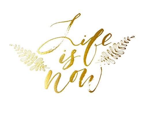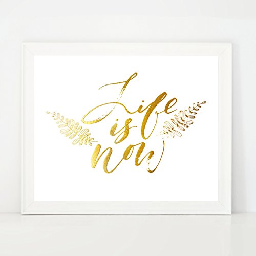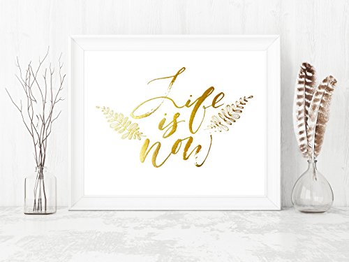 This is a quirky and playful home interiors gold foil art print displaying 'Life Is Now'.'