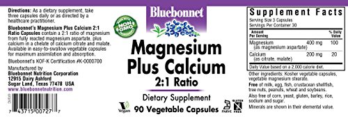 Bluebonnet's Magnesium Calcium 2:1 Ratio is used to improve bone support and reduce the risk of disease. Bluebonnet's Calcium Magnesium 2:1 provides a 2:1 ratio of magnesium from fully reacted magnesium aspartate, plus calcium in a chelate of calcium citrate and malate. Available in easy-to-swallow vegetable capsules for maximum assimilation and absorption,.Feature