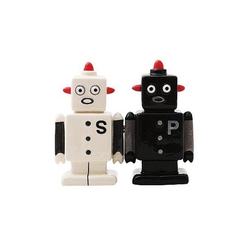 Campy Robots Salt and Pepper Shaker Set - Handpainted Magnetized Ceramic by Pacific Giftware