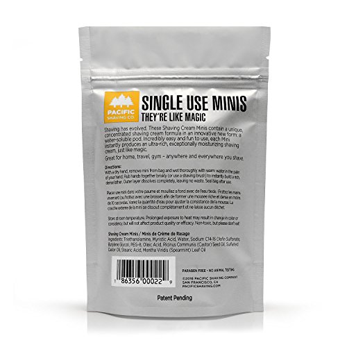 -. Binding : Health and Beauty -. Brand : Pacific Shaving Company -. EAN : 0186356000229 -. Feature : Instant lather in the palm of your hand / First ever shaving cream mini in a water-soluble, food-grade film / Convenient & concentrated / They're just like magic -. IsAdultProduct : 0 -. Label : Pacific Shaving Company -. Manufacturer : Pacific Shaving Company -. Model : 186356000229 -. MPN : 186356000229 -. PackageQuantity : 1 -. PartNumber : 186356000229 -. ProductGroup : Beauty -. ProductTypeName : BEAUTY -. Publisher : Pacific Shaving Company -. Studio : Pacific Shaving Company -. Title : Pacific Shaving Company Single Use Shaving Cream Minis -. UPC : 186356000229