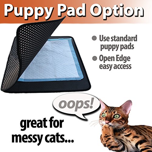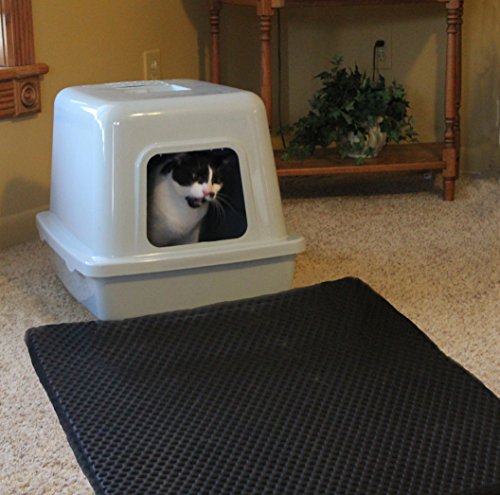 Traps litter from cats paws and litter from box. Litter falls through extra large holes (larger than competition).