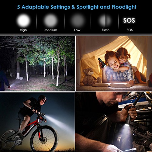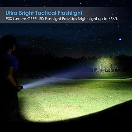 - ULTRA BRIGHT FLASHLIGHT: 900-lumen (max) CREE LED flashlight provides bright light over a beam distance of 330ft/ 100m and reaches nearly 656ft/ 200m. Features 5 adaptable settings: High / Middle / Low / Strobe / SOS.