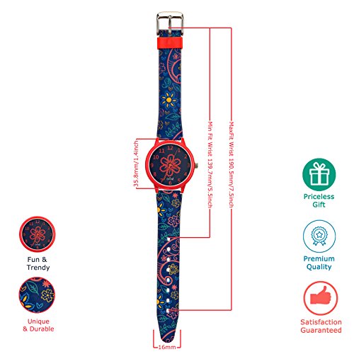 This is one of the coolest, cutest, trendiest, and most practical wrist watches for girls. Our children’s watch is made with a very high quality Japanese movement which ensures accurate timekeeping and is powered by a premium quality Sony battery. It fastens with a paisley designed strap and has a colorful, very clear facade for the kids to recognize the numbers for faster time-reading.