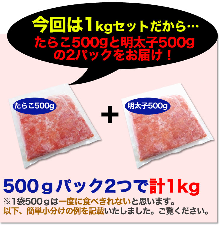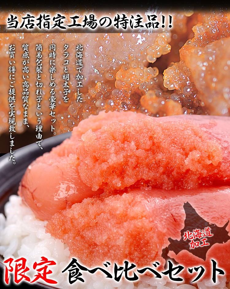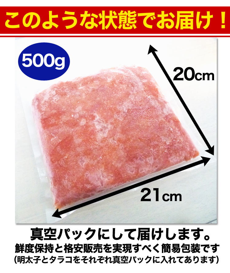 ・商品名切れタラコ&切れ辛子明太子食べ比べセット・原材料名・切れタラコ:助宗鱈卵(ロシア)、食塩、調味料(アミノ酸等)、酸化防止剤(V.C)、ナイアシン、酵素、着色料(赤102、黄5)、発色剤(亜硝酸Na)・切れ辛子明太子:助宗鱈卵(ロシア)、食塩、香辛料、鰹節エキス、昆布エキス、粉末醤油、調味料(アミノ酸等)、ソルビトール、酸化防止剤(V.C)、酒精、ナイアシン、酵素、pH調整剤、香料、発色剤(亜硝酸Na)、(原材料の一部に大豆、小麦を含む)・加工地:北海道・内容量(重量は冷凍時)・切れタラコ:約500g前後・切れ辛子明太子:約500g前後・賞味期限パッケージ記載・保存方法要冷凍-18度以下で保存してください・お召し上がり方解凍して、そのままお召し上がり頂けます。・製品について大きすぎる為、サイズをそろえるときに切り落とした部分や加工中に皮が破れてしまった切子・割子・バラ子となります。・発送形態冷凍発送冷凍品、常温品と一緒に同梱包して発送ができます(冷蔵品との組み合わせは不可)