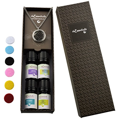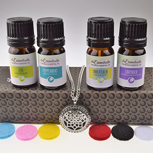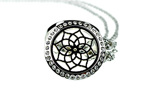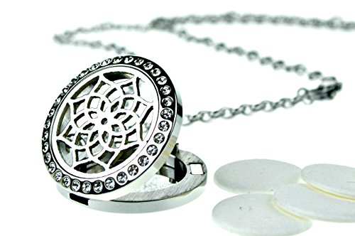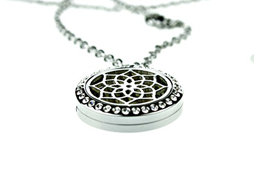 Flower CZ's Essential Oil Diffuser Necklace Stainless Steel Locket Pendant with 24" Chain+ 4 Essential Oils (Lavender Peppermint Inner Peace Zen) Gift Set
