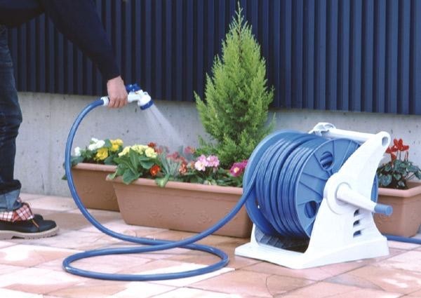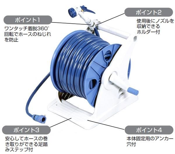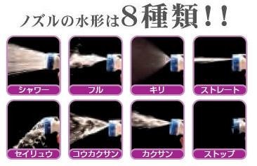 用途に合わせて8種類の水形に切替可能です。蛇口からの着脱が簡単な3点ビス蛇口コネクターを使用。ノズルをすっきり収納できるノズル押え付。足踏みステップがついていますので、安心してホースの巻き取りができます。 |