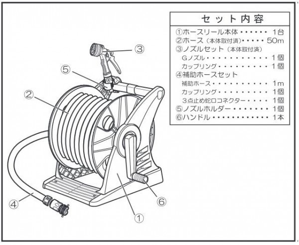 | 仕様 | 適用蛇口サイズ:丸型蛇口外径16mm 主ホース(中黒):内径15mm・外径20mm、長さ50m 補助ホース(中黒):内径15mm・外径20mm、長さ1m |