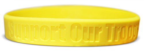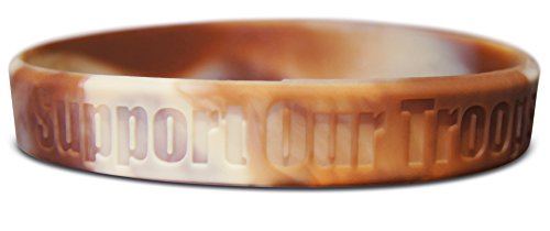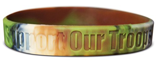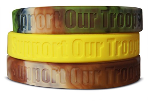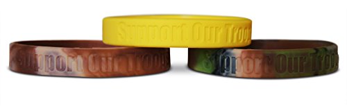 THREE SILICONE rubber wristbands with debossed Support Our Troops printing. Adult size that is 8" inch around the wrist. Made to withstand all wear and tear and easy to wear for everyday activities.
