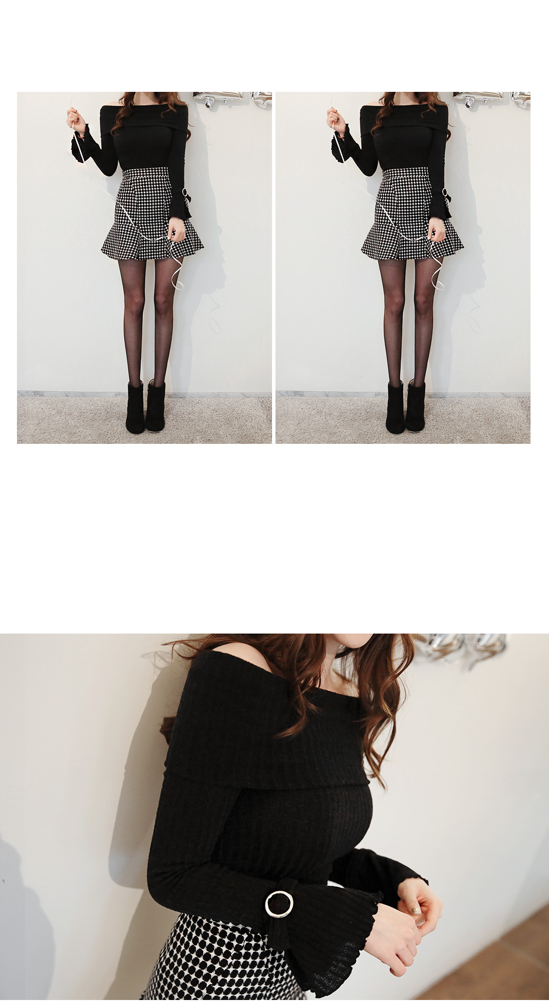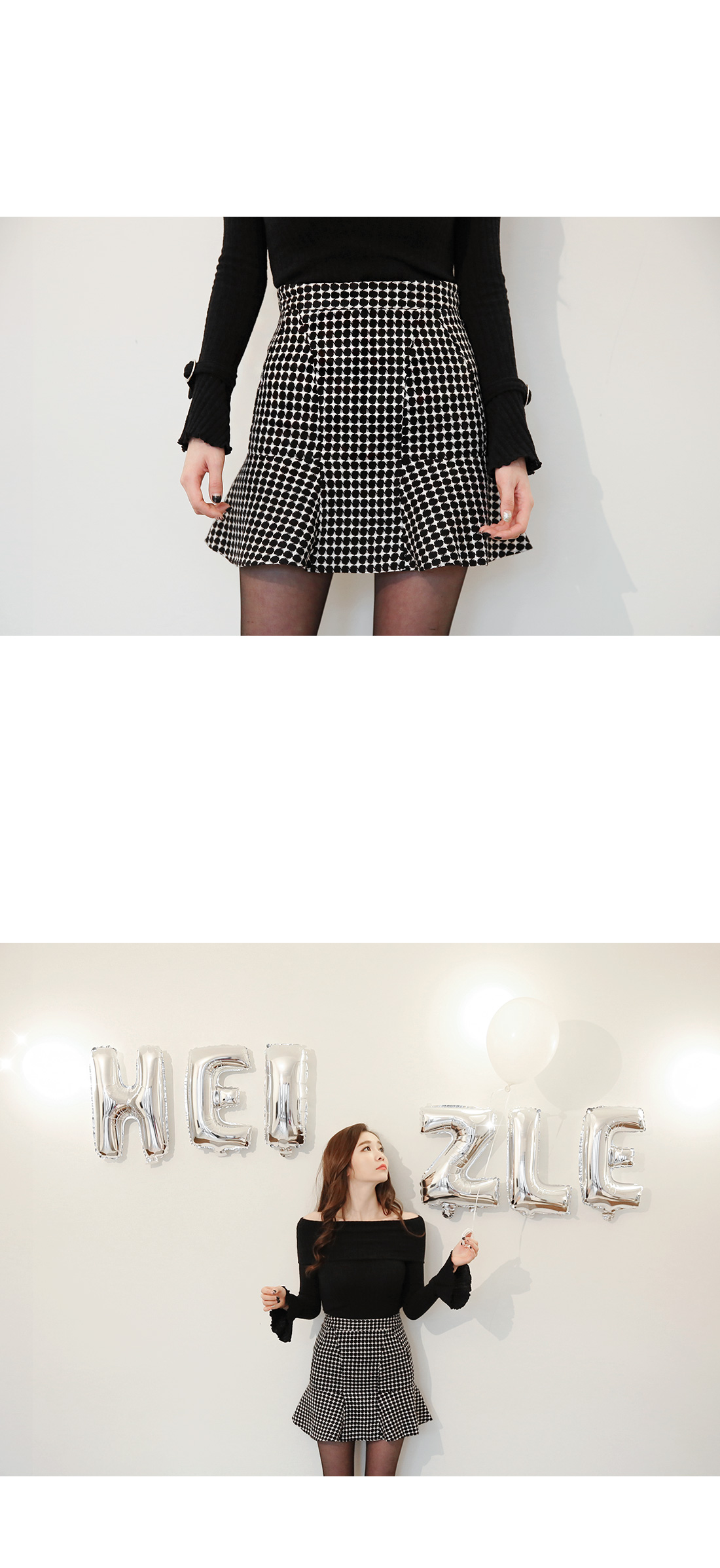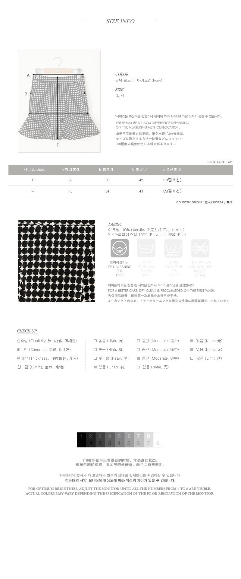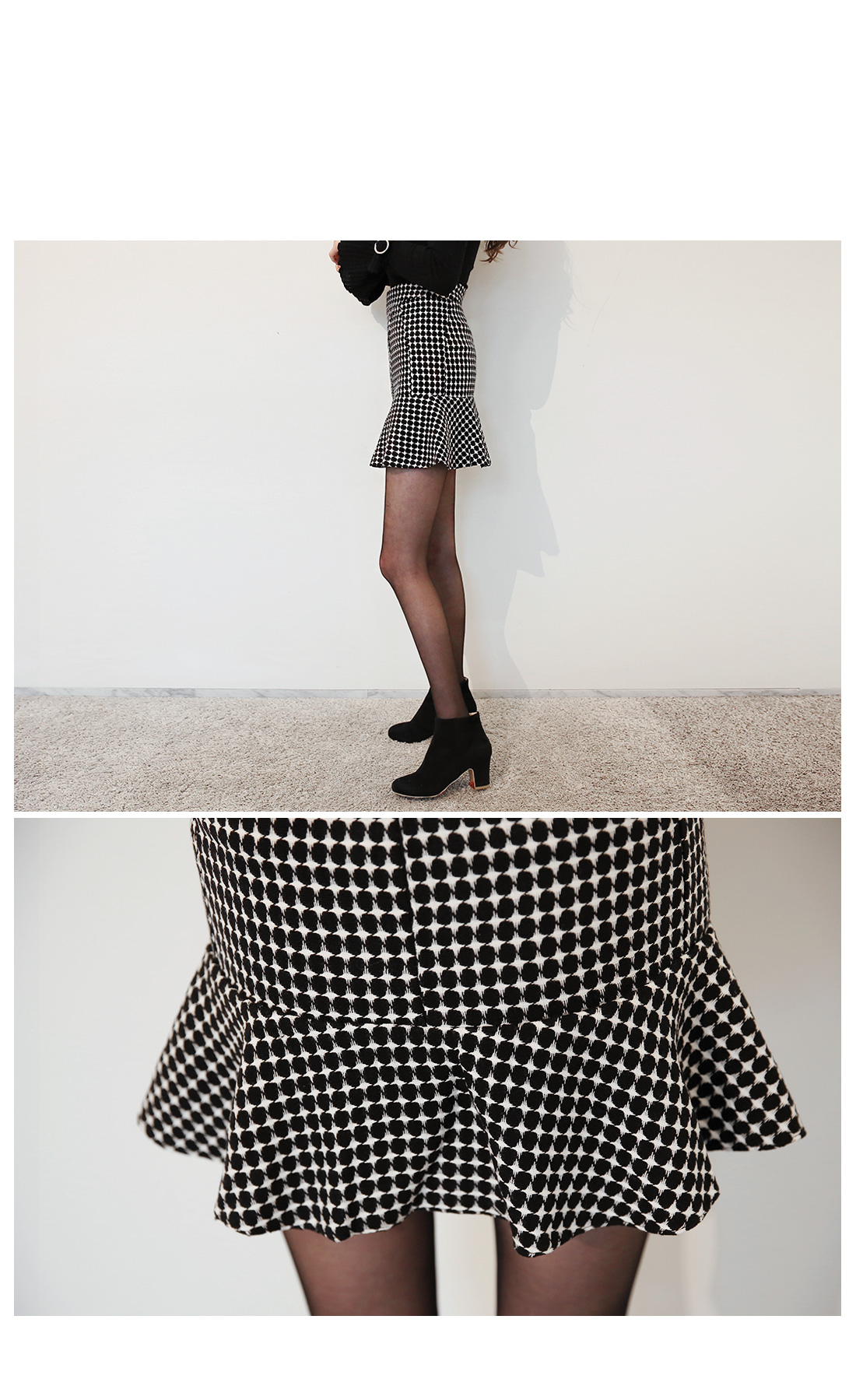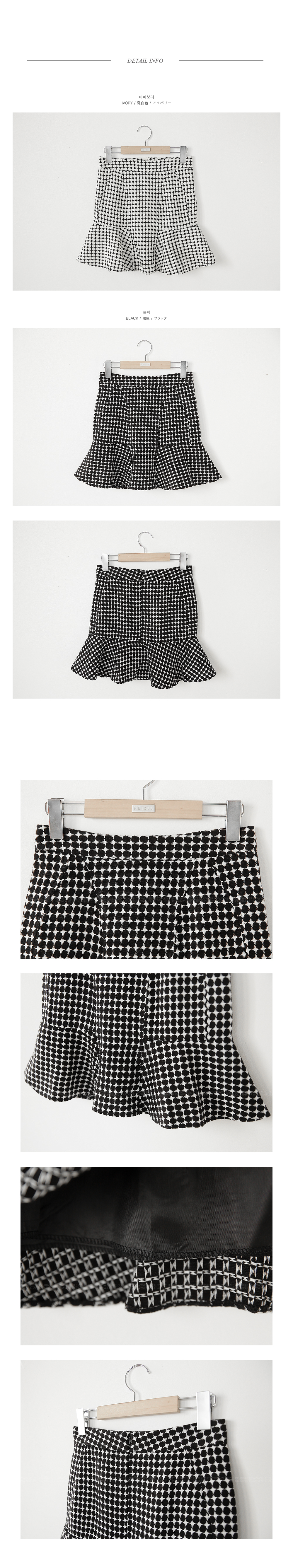 페미닌한 실루엣의 스커트에요~적당한 두께감으로 겨울시즌뿐 아니라봄,가을에도 연출하기 좋구요심플한 체크 패턴이 포인트되는 스커트에요!힙라인은 타이트하고 밑단 프릴 디테일로여성미를 강조해 준 아이템이구요,심플한 룩에 무심한듯 매치해도 포인트되어활용도가 높은 코디 아이템이에요~어디에나 손쉽게 잘 어울리는포인트 아이템으로 추천해 드려요^^