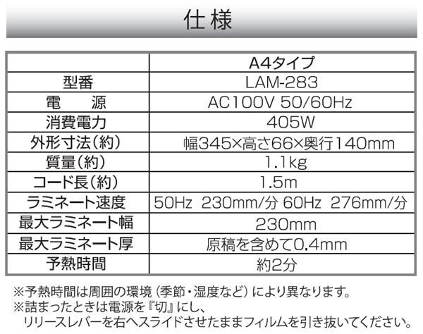 100ミクロンフィルム対応。電源を入れてから約1時間後にヒーターの加熱が停止するオートオフ機能付きで、消し忘れの心配もありません。 製造国:中国 付属品:保証書付取扱説明書(保証期間:1年間) ※サプライヤー直送品 ご注文後2~3営業日後の出荷となります【商品名】オーム電機 OHM パーソナルラミネーター A4タイプ LAM-283
