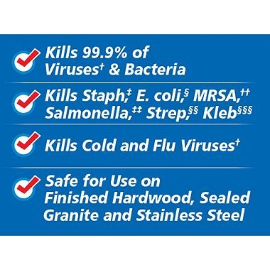 -. Feature : Kills 99.999% of viruses and bacteria, including Human Coronavirus and Influenza A2 Virus / Kills cold and flu viruses, E. Coli, Salmonella, Staph, and Strep / Pre-moistened, thick, textured wipes / Clear-drying formula works on a variety of surfaces / Use where germs build up all day, on countertops, doorknobs and bathroom surfaces
