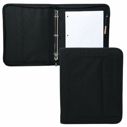 14" W x 11.5" H x 2" D . 600D Ripstop Polyester . Three non-removable 'O' ring binder. Inside elasticized pockets and business card holders . Front velcro gusseted pocket . Three-sided zipper closure . Paper pad and pen included