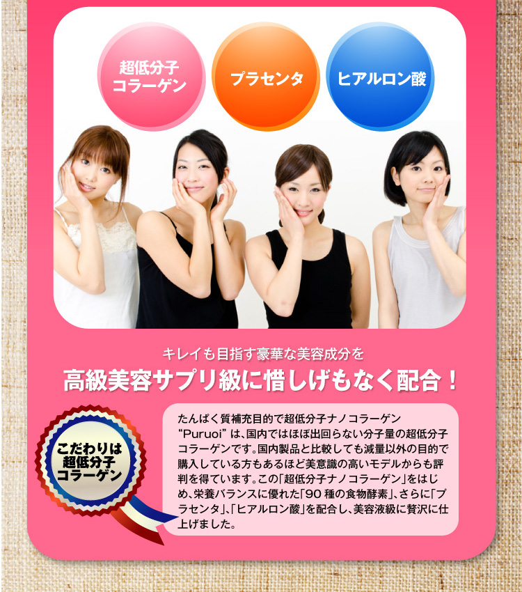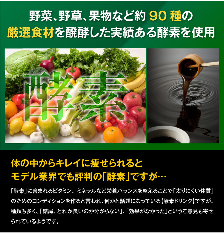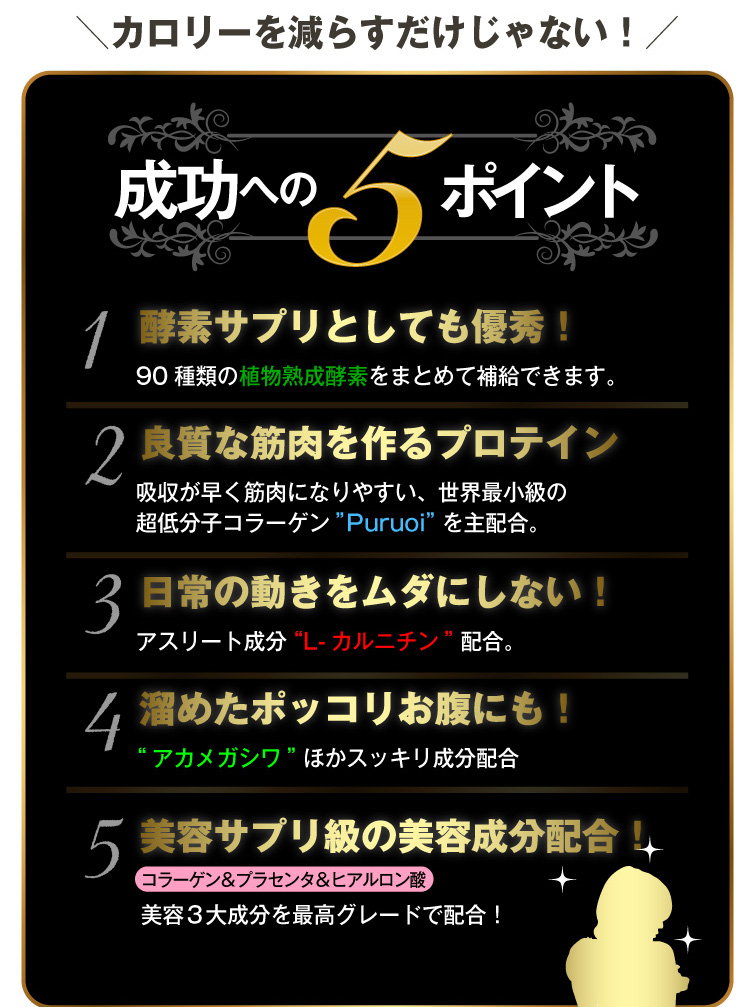 L-カルニチンフマル酸塩、アカメガシワエキス末、植物発酵 エキス末(デキストリン、オリゴ糖、砂糖、てんさい糖、ヨモギ、 その他)、食物繊維、サラシアレティキュラータエキス末、白い んげん豆エキス末、乳酸菌末(殺菌乳酸菌、デキストリン)、 ガルシニアエキス末、豚胎盤エキス末、酸味料(リンゴ酸)、 香料、着色料(アントシアニン)、甘味料(アスパルテーム・L- フェニルアラニン化合物、スクラロース)、卵殻カルシウム、ヒ アルロン酸、(原材料の一部に乳、豚肉、りんご、やまいもを含む)