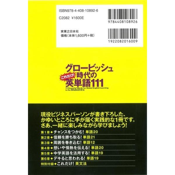 【商品基本情報】 商品名称:グロービッシュ時代のこれだけ!英単語111 CD付き 著者/出版社:阿部川 久広/阿部川 久広 初版発行日:2011/04/23 サイズ:B6判 ページ数:208 ISBN/JAN:9784408108926/4528189485303