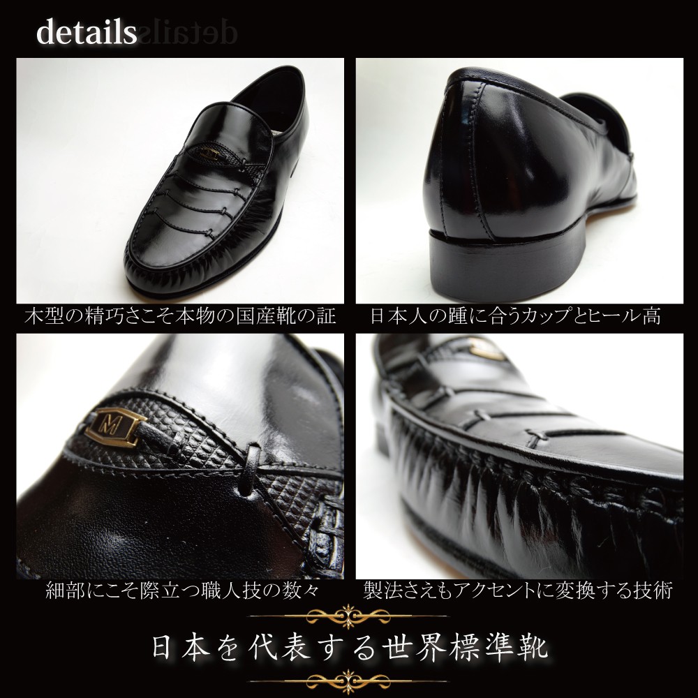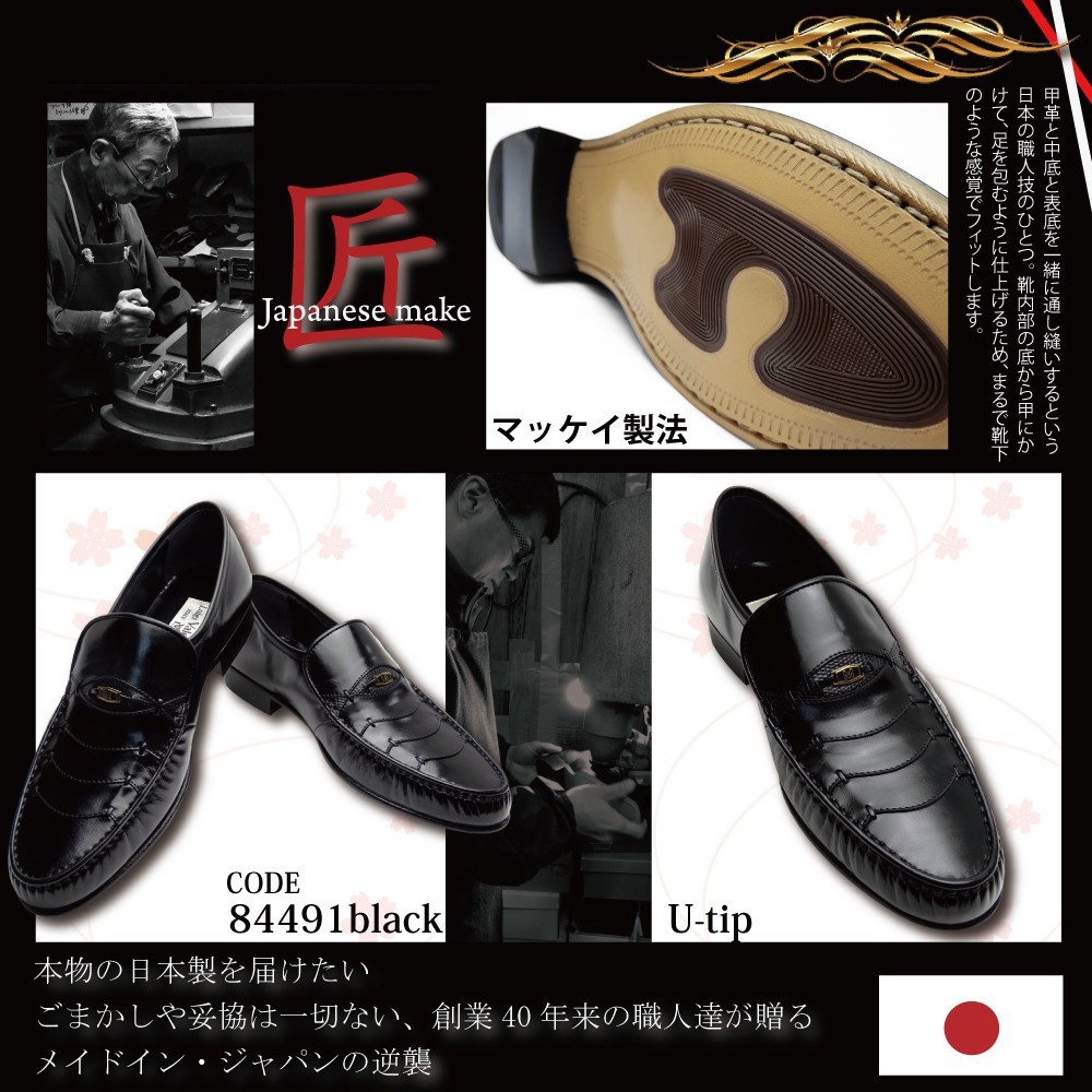 アッパー:本革 キップスキン (製造過程において、革質を厳選した際にキップもしくはカーフへと変更になる場合がございます。) 本底:本革+ゴム底 |