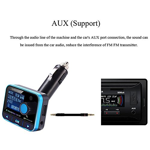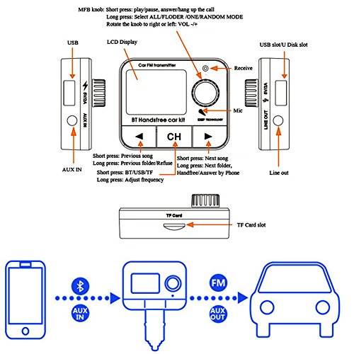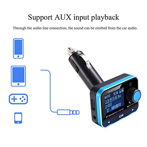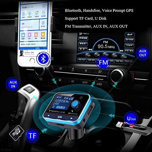 Feature : FM Transmitter, Bluetooth, Hands-Free, Voice prompt GPS, Music player, Audio car kit, Radio adapter. / Two ways to connect your car: FM connection and aux output connection. Through the audio line connection, the sound can be emitted from the car audio. / This fm transmitter supports TF Card, U Disk, AUX in AUX out. After the successful connection, the sound can