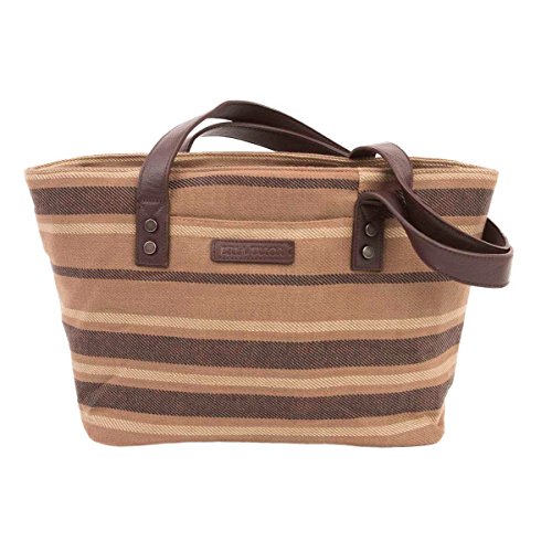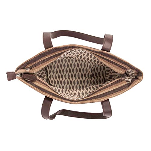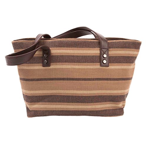 Product Description The Elisha Mini Tote is just the right size for a night out. Elisha radiates a classic, go-everywhere design with twill weave cotton, cedar brown, ebony, and tan. Features coffee brown leather straps. Mini Tote: 14" opening, H 8" Base: W 10" x D 5". 2 straps 22" x 1". 10" shoulder drop. 2 slip, 1 zip inside pockets. 1 outside slip pocket. Base features supporting vegan leather strips providing stability. 0