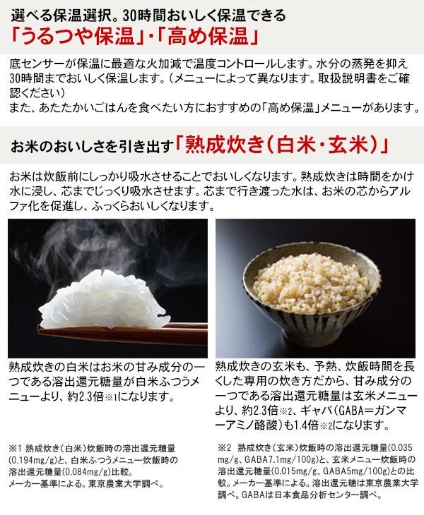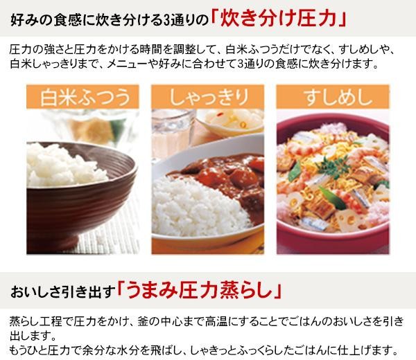 | お米が対流しやすいまる底の釜を使用している炊飯ジャー。好みの食感に炊ける「炊き分け圧力」やお米のおいしさを引き出す「熟成炊き」等、ご飯をおいしく炊く為の様々な機能を搭載!! |