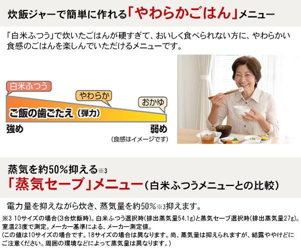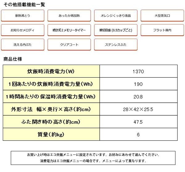 | 付属品 | しゃもじ、しゃもじ受け、計量カップ(白米用・無洗米専用)、取扱説明書兼保証書(保証期間:1年間※内釜フッ素加工:3年間) ※取扱説明書に「お料理ノート」ページあり |