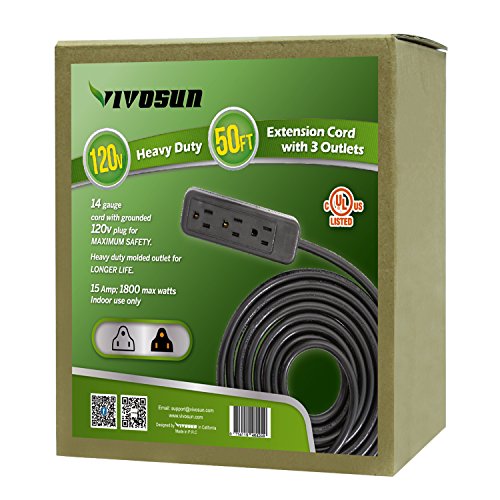 VIVOSUN 50FT 3-Outlet 14 Gauge 120V Heavy Duty Power Strip Extension Cord UL Listed Black