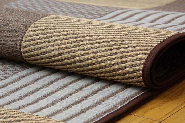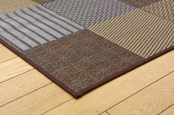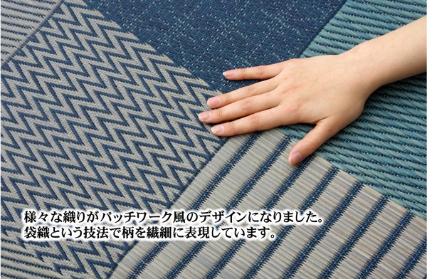 いろいろな織りを組み合わせたパッチワーク風のい草カーペットです。織り方によって違う複数の肌感触をお楽しみ頂けます。落ち着いた色目でモダンな雰囲気に仕上げました。縦糸の本数が多い袋織りという技法で繊細な柄を出しています。折れ曲がりが複雑なので長いイ草を使用しないと切れてしまいます。縦糸が密なので、しっかりとして破れにくいのが特徴です。国産(九州産)のい草を使用しています。一本一本が太く、表皮が厚く繊維がキメ細かいので弾力性があり、耐久性に優れています。い草には空気の自然浄化作用、湿度の調節作用などがあります。また汚れにくく、使用するうちに黄金色に変化し味が出ます。い草に青森ヒバ加工を施しています。(抗菌、防臭効果)