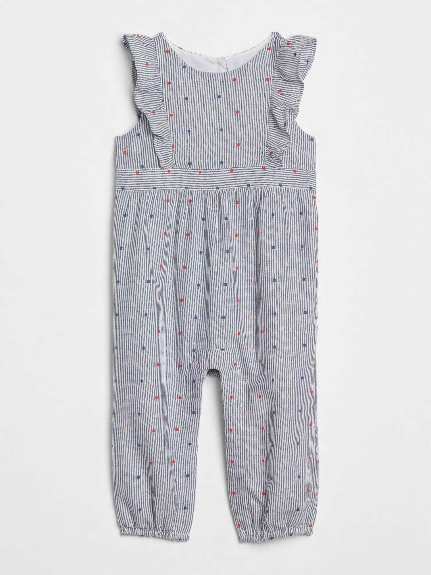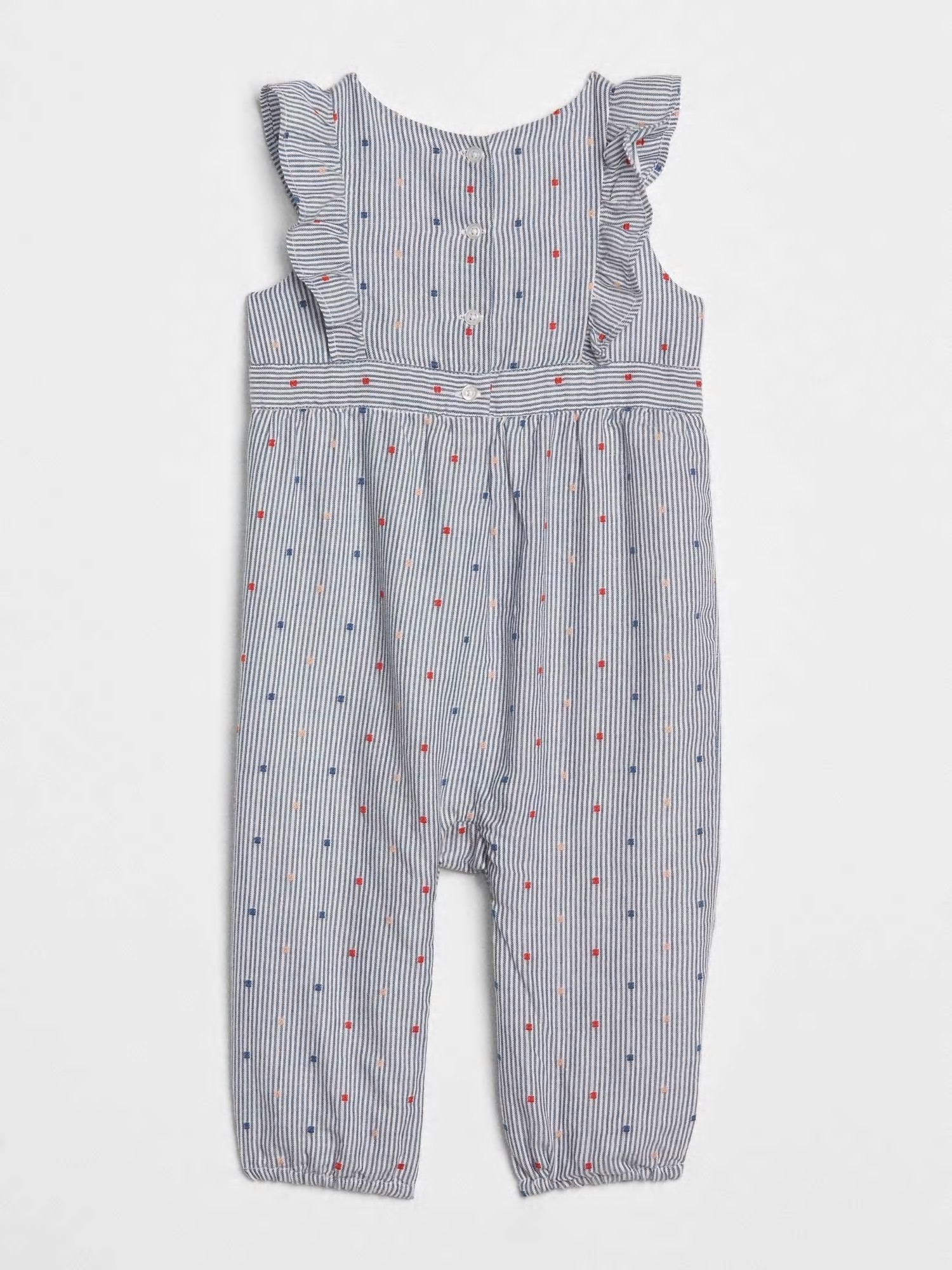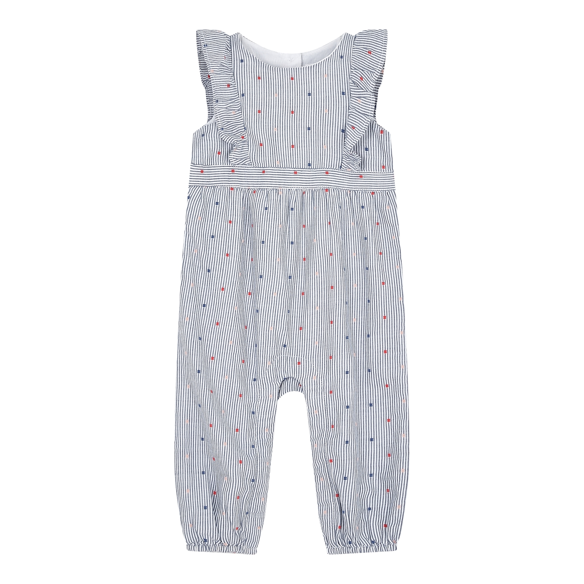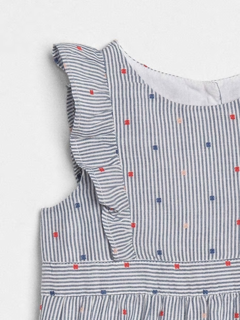 컬렉션 : 2018 Fall/Winter 디자인 포인트 : - 스트라이프 패턴에 컬러풀한 자수가 있는 러플 소매가 달린 오버롤 스타일링 추천 : 단품 착용 및 바디수트와 레이어링하여 스타일링