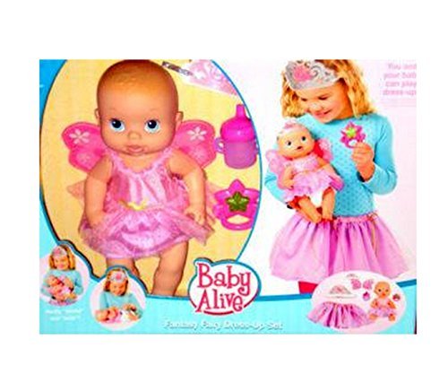 -. Binding : Toy -. Brand : Hasbro -. Department : Toy -. EAN : 0653569403418 -. Feature : This Baby Alive Fantasy Fairy Doll is the doll that your little girl dreams about / So pretty, this special doll is dressed in a fairy outfit and also comes with a tutu and tiara for your little girl to wear - ideal for dress-up play / Girls love taking care of the Baby Alive Fantasy Fairy Doll / She drinks from her sippy cup. She actually wets her diaper, which gives girls the chance to learn about diapering / Doll is dressed in fairy wings, tutu and tiara. Dress-up set comes with a tutu and tiara that little girls can wear. Includes sippy cup, rattle and doll diaper. Ages 3+ -. IsAdultProduct : 0 -. Label : Hasbro -. Manufacturer : Hasbro -. ProductGroup : Toy -. ProductTypeName : TOYS_AND_GAMES -. Publisher : Hasbro -. Studio : Hasbro -. Title : Baby Alive Fantasy Fairy Dress Up Set with Toy Doll by Hasbro -. UPC : 653569403418