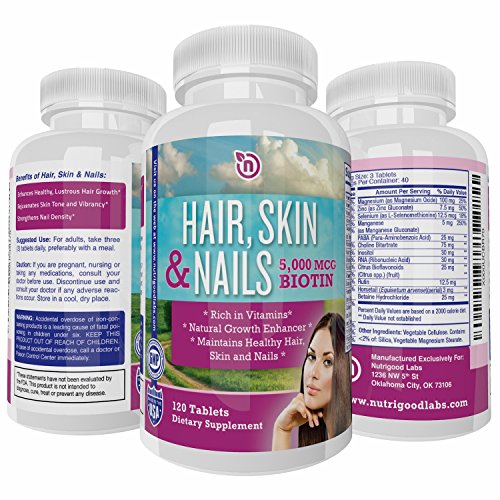-. Title : Natural Skin Hair and Nails Vitamins - 5000mcg Biotin for Growth Hair and Nails - Hair Regrowth Supplement for Baldness and Hair Loss Prevention - 25 Pure Active Ingredients to Strengthen Hair and Nails - 120 NON GMO Vegetarian Safe Tablets by NutriGood Labs