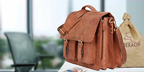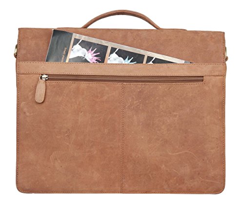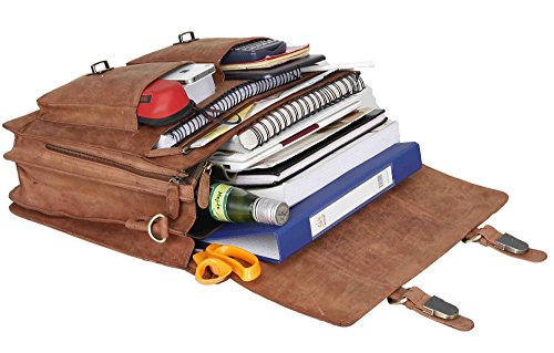 -. Feature : 100% GENUINE HUNTER VINTAGE LEATHER: Crafted from tough, 100% Semi Full-Grain Boot Leather, which takes hits well and looks even better with age. Full-Grain Leather is the top layer of the cow skin which is the most expensive and toughest part. The distinguishing feature of this leather is that the leather may have wrinkles, scratches that are inherent characteristics. / CRAFTMANSHIP, STICHES AND PARTS: Our Products are handmade by Professionally Skilled Craftsmen, because of which the bags have best finishing in its class. Brass/ Metal Fitting Buckles and Holders are Internally Lined with Strong Green Canvas make it Durable and Long Lasting. Every stress point on this bag is double-stitched and riveted or reinforced with hidden nylon strapping. / PERFECT FOR ANY SITUATION: Looks great in the courtroom, boardroom, on worldwide travel. We have received countless positive testimonials from company executives, lawyers, military personnel and college students who love their classic messenger briefcase bag. / FEATURES AND COMPARTMENTS: 13" Tall x 15.5" Wide x 5" Deep with 3 large main compartment sealed by a leather cover with magnet closure, 1 large zip pocket within the main compartment (ideal for laptops), 1 secondary compartment in front of the spacious main compartments, 1 zip pocket in front of the spacious main compartments, 2 smaller, separately attached compartments which are sealed by the leather cover with magnet closure, 1 zip pocket on the back.