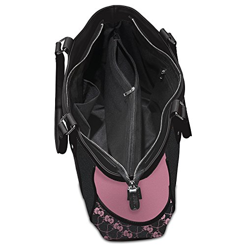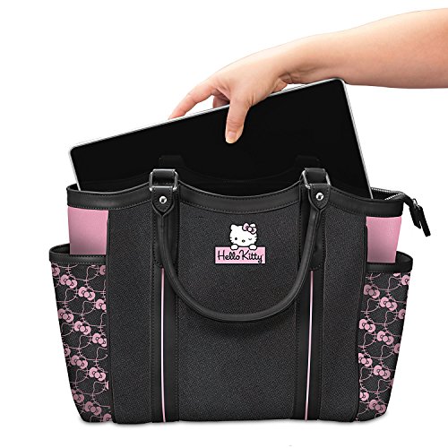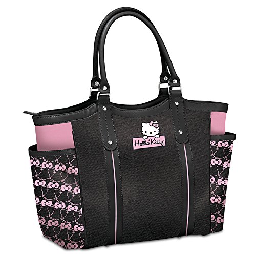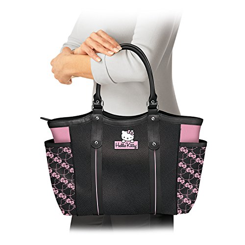 Product Description The cutest girl you'll ever meet is bringing her famous style to this carry-everywhere tote, the Hello Kitty® Style Icon Tote Bag, a custom fashion design exclusively from The Bradford Exchange. This Hello Kitty shoulder tote bag is beautifully crafted of black polyester twill with black faux leather trim and handles. Front and center on this style icon bag is an applique patch of Hello Kitty peeking over her signature, as well as two lined exterior side pockets adorned with a custom print of Hello Kitty silhouettes.This unique applique patch tote bag also has a lined interior with a center zip pocket large enough to hold a laptop, and includes an additional inside zippered pocket and two accessory pockets. And unlike many shopper totes, this one features a zippered closure at the top for extra security. Silver-toned hardware and a detachable, adjustable shoulder strap complete the look. This stylish tote bag is perfect for Hello Kitty fans looking for an adorable take on a functional fashion accessory. We expect strong demand. So, don't delay. Order now! - A zippered closure at the top provides extra security