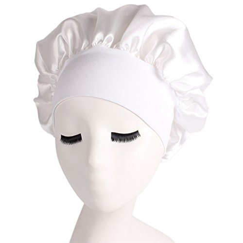 Women’s Elastic Wide Band Sleep Night Cap Head Cover Bonnet Hat for For Curly Springy Hair (White)