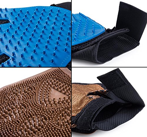 COADOM Pets Grooming Gloves fit comfortably around your hand. Both gloves has adjustable wrist straps to keep them secure. No more brushes and combs that your pets hate. Great pet hair remover for all sizes and breeds. The latest design with silicon tips helps you to get deeper and massage your pets. Improves health of your pets by increasing blood circulation. The rubber side can be used either wet or dry. The soft silicone bristles gently massage your pet while the hair gets lifted away. When enough hair collects in the glove, the layer will peel right off! You can also clean your gloves with warm water and a mild soap and then let air dry.