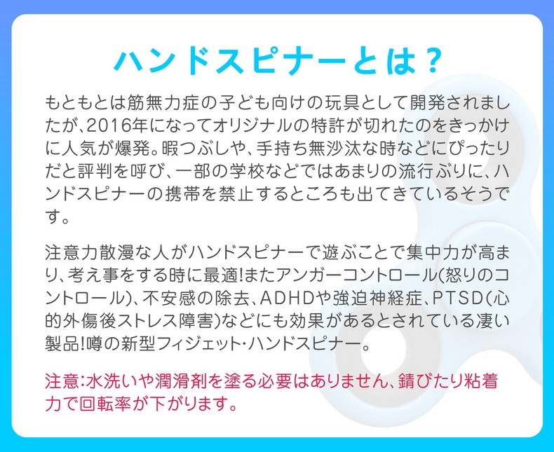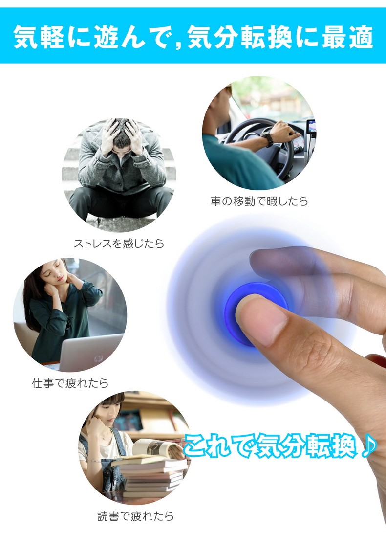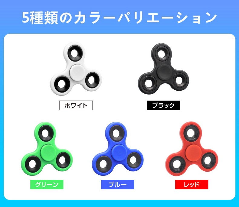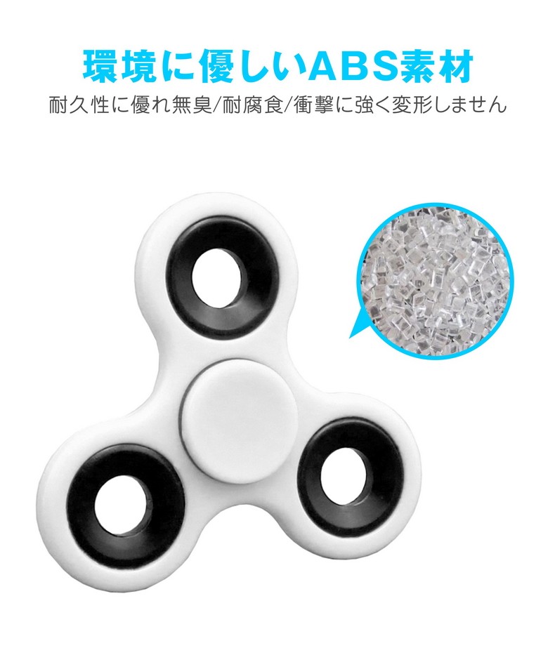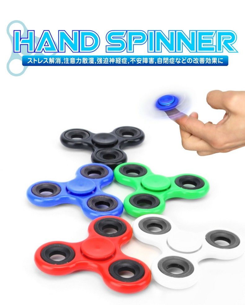 赤字覚悟の大特価豊富なカラーバリエーションで多色買い必至です♪カラー(全5色)1.ホワイト2.ブラック3.グリーン4.ブルー5.レッドコンパクトで軽量、指先でストレス解消!使い方はとっても簡単!指2本で本体を固定して回すだけ。たったそれだけなのにストレス解消、自閉症対策、集中力向上、思考力UP、息抜きが出来ます。素材には耐久性に優れ、環境にやさしいABS樹脂を使用。丈夫で長持ち変形しにくく無臭。更にハンドスピナーで最も重要なベアリング部分には高品質で精密な設計が施されておりますので、静音で高速回転を長時間維持することが可能です。55gと超軽量なので、指先1本で回す技など様々なトリックプレイも思いのまま。まさに遊び方無限大!