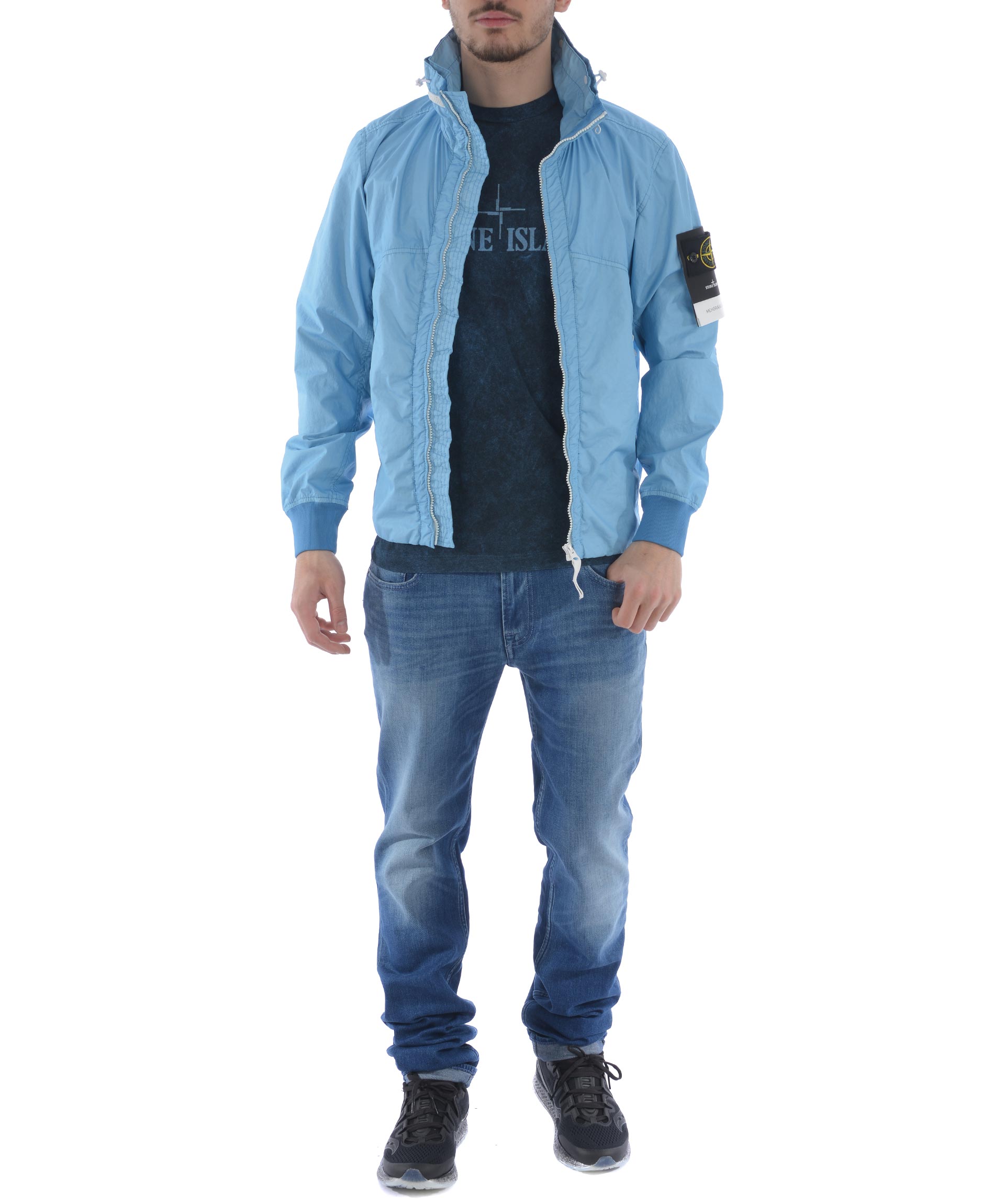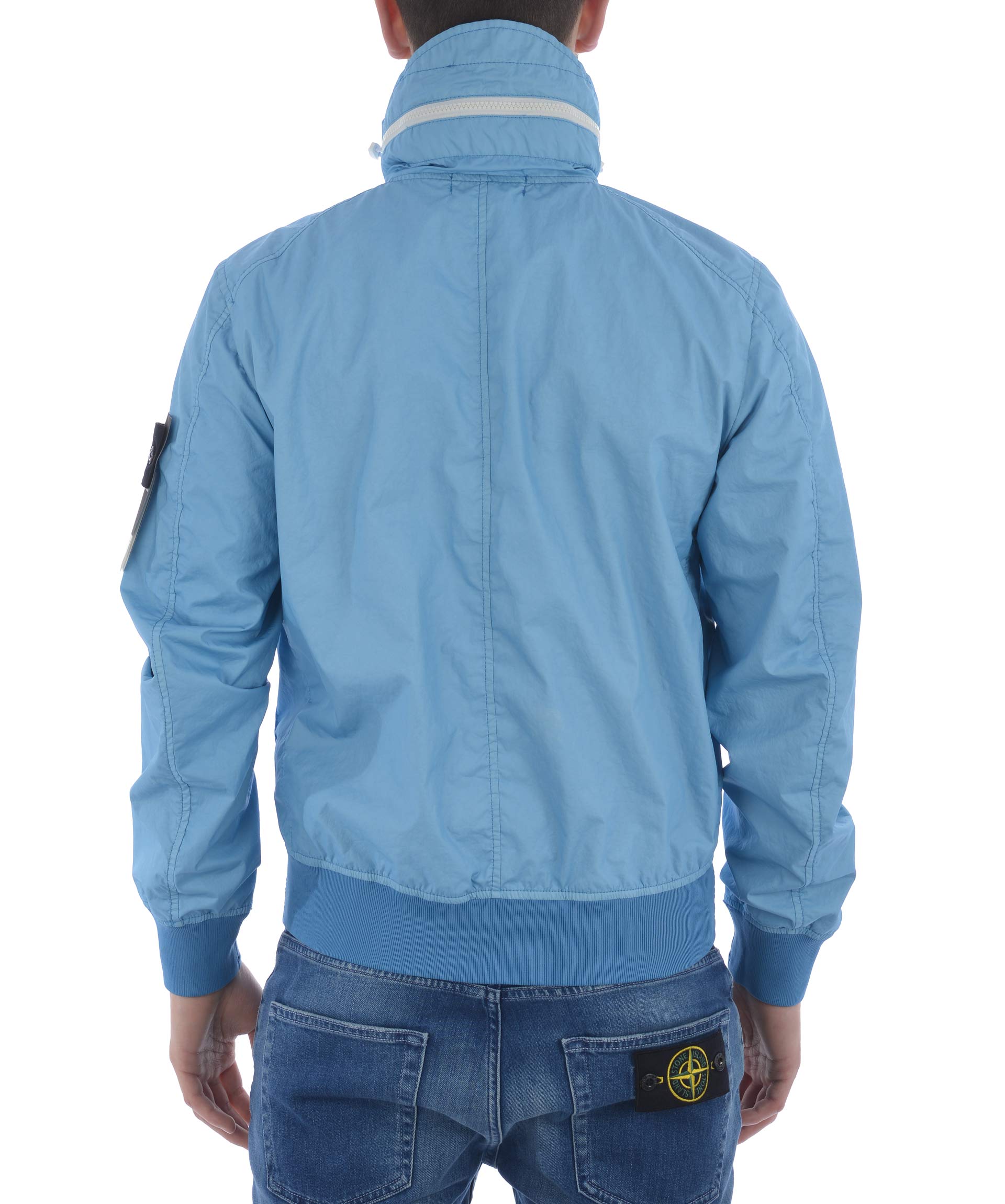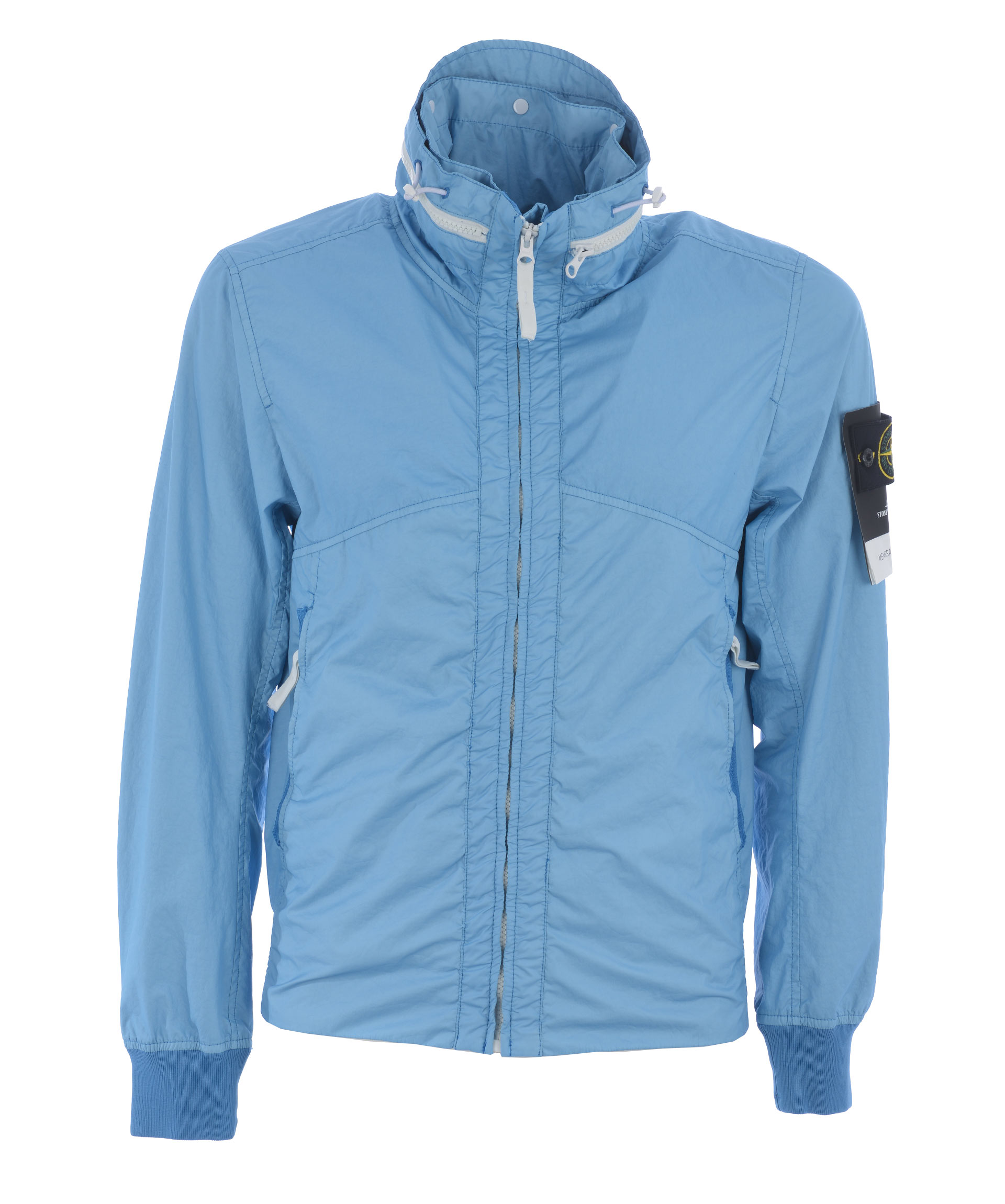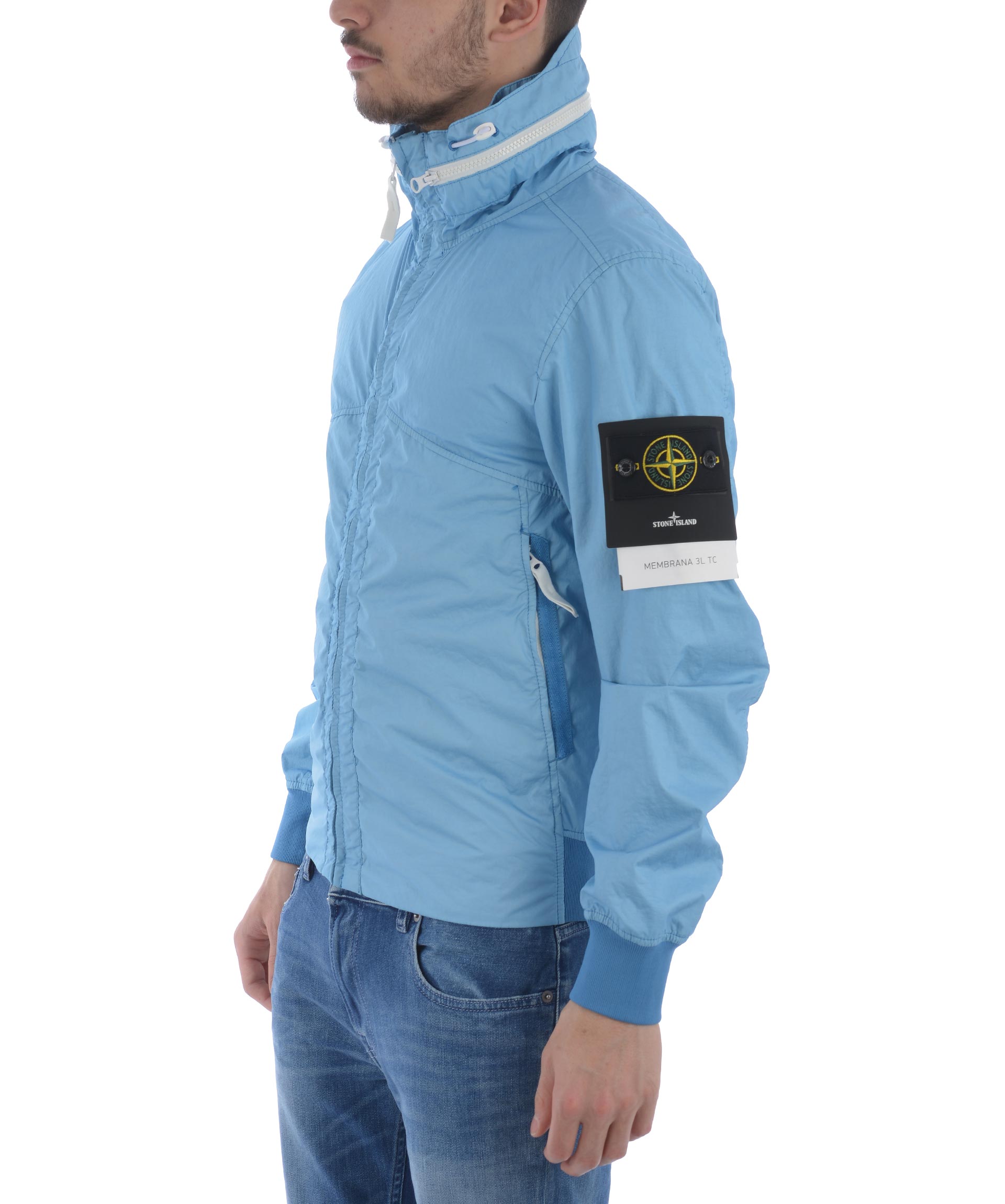 Giubbotto Stone Island "membrana 3L-TC" in nylon opaco Celeste. Idrorepellente, antivento. Collo alto con coulisse e cappuccio interno. Tasche frontali con zip. Chiusura frontale con zip. Polsi e fondo a costine. Interno sfoderato. Logo removibile sulla manica sinistra.
