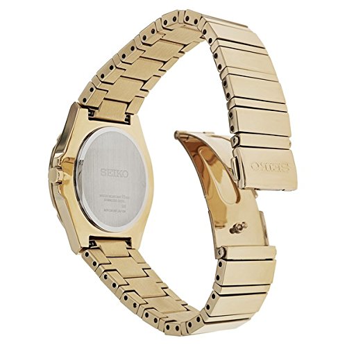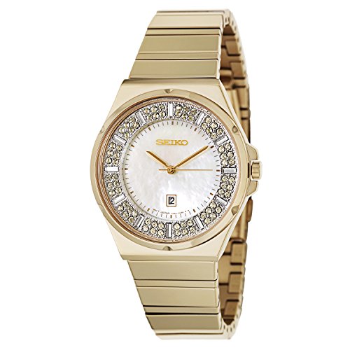 Dress watch, Japanese quartz movement, Polished gold-tone hands, Polished gold-tone sweep seconds, Analog date aperture, Double-layer beige mother-of-pearl dial with genuine Swarovski® crystal embellishment and polished gold-tone logo applique, Polished gold-tone stainless steel bracelet with adjustable links and push-button-invisible-double-locking-clasp (butterfly-clasp), Polished gold-tone stainless steel bezel, Large polished gold-tone stainless steel round case, Polished gold-tone steel crown, Stainless steel caseback, Hardlex crystal, 10 ATM (100 meters/330 feet water resistant)Feature