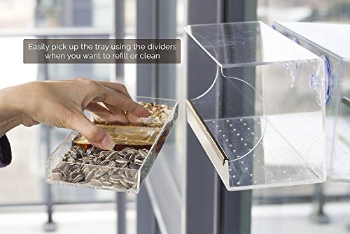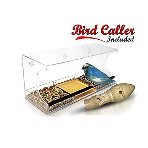 EASY TO INSTALL HANGING WINDOW FEEDER, FILL, AND CLEAN. COMES WITH FREE REMOVABLE TRAY WITH WHOLES. TIP: To make this a squirrel proof bird feeder, mount high on a window away from jump-off points. Squirrels (and other pests) cannot climb glass windows. Better then a birdhouse as it comes with a bird caller like a whistle best for attracting cardinals. This durable and lightweight window bird feeder is 11.8 x 5 x 4 inches. Mounts to any window without a screen as its made and designed unique