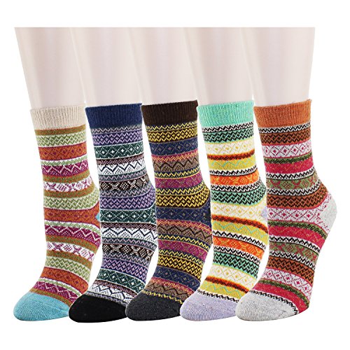 -. Feature : SIZE and MATERIAL: Fit women shoes size 5-10; 35% wool, 24% cotton, 36% polyester and 5% spandex; light weight, warm without being bulky, soft, comfortable, and toasty socks. / THICKNESS: They are thick but not overly so, and just the right thickness for comfort and warmth with boots, loafers or sneakers. Not terribly thick, but thick enough to keep your feet warm in winter. / COLORFUL PATTERN: Vibrant colors, super cute and versatile! Fun whimsical assortment of patterns & colors, well-made socks; These are a mid way between ankle and calf socks and help brighten up an otherwise boring work uniform. / FUNCTIONAL: Ultra-plush softness and flexibility with the perfect jacquard weave keep your feet from getting sweaty. No itchy, non-binding, great stretch; The elastic at the top is strong, so they stay up just fine but don't squeeze your leg. / PACKAGE: 5 Pairs in plastic zippered Zmart bag, perfect birthday or Christmas gift to your loved ones. Be great to wear to the office with trousers, to the cabin with boots, around the house or on a camping or ski trip.
