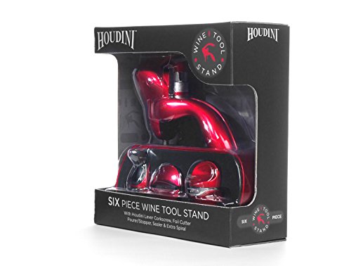 - Feature : Wine tool stand offers tools to open, serve and seal wine; permanently housed in the stand / Houdini lever style corkscrew tested for 20,000 pulls, all-metal gears / Accessories: foil cutter, pourer/stopper, wine/champagne sealer and spare spiral / Red metallic / 5 year warranty / A Houdini Corkscrew pulls a cork in 3 seconds flat; includes an extra spiral for the Houdini Corkscrew / Comes with a stand for storage and presentation; the Foil Cutter removes foil cap before opening / This is a great wine tool set that opens, serves, and preserves wine; a great set for both the wine expert or the beginner / Use the Wine Pourer/Stopper to pour smoothly, and drip free while stopper also seals wine air-tight / Wine/Champagne Sealer seals wine air-tight and expands to seal all bottle sizes